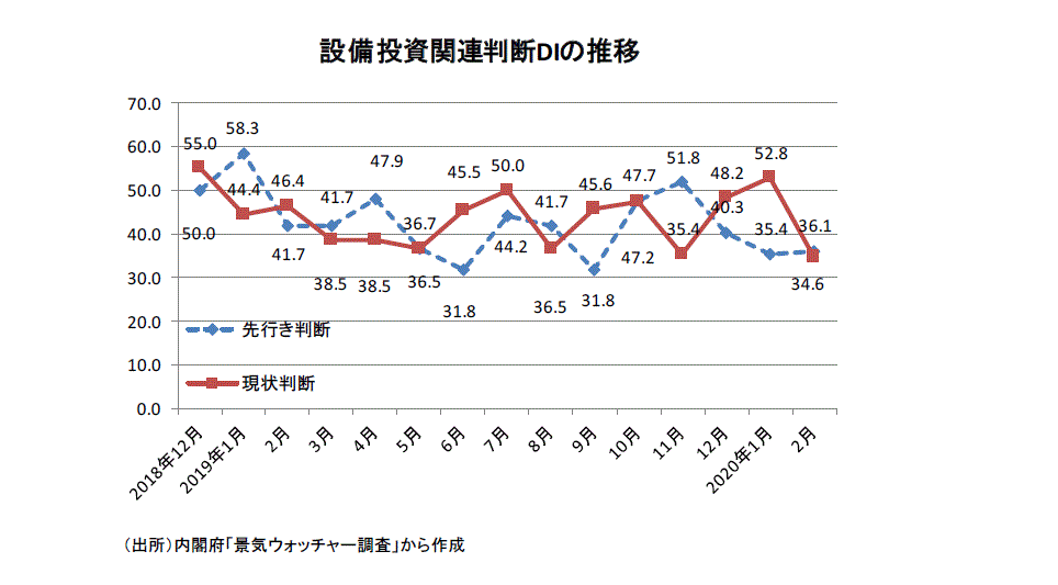 ●景気ウォッチャー調査の設備投資関連・DIの最近の動きをみよう。19年12月には、設備投資関連・現状判断DIが48.2(回答したウォッチャー14人)と19年7月50.0以来の水準に戻った。20年1月の現状判断DIが52.8(同9人)と18年12月分の55.0以来の50超となった。グラフからは設備投資関連・現状判断DIの底堅さが感じ取れるようになってきていた。しかし、新型コロナウイルスの影響で20年2月の現状判断DIは34.6(同13人)へと急落した。