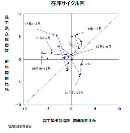 ●経済産業省は基調判断を19年8月分・9月分の「総じてみれば、生産はこのところ弱含み」から、10月分で15年8月分以来の「総じてみれば、生産は弱含み」に下方修正し、11月分・12月分でも判断を据え置いていたが、20年1月分では「総じてみれば、生産は一進一退ながら弱含んでいる」と上方修正した。2月分も判断は据え置きになった。