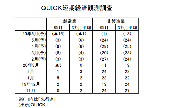 ●QUICK短観3月調査の製造業の6月までの「先行き見通し」は▲15で3月実績の▲5から10ポイント悪化の見込みである。非製造業の6月までの「先行き見通し」は+1で3月実績の+11から10ポイントの悪化予想である。新型コロナウイルスの影響で一段と景況感が落ち込む見通しとなっている。