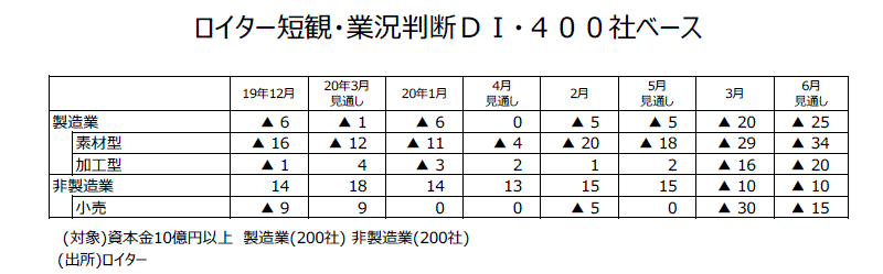 ●また、ロイター短観3月調査400社ベースの非製造業DIは12月調査の+14から24ポイント悪化し▲10となった。また、200社ベースの非製造業の業況判断DIは12月調査の+8から23ポイント悪化し▲15となった。