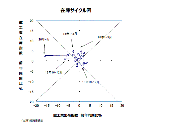 ●大きな動きをチェックするために、鉱工業全体で縦軸に在庫の前年比を、横軸に出荷の前年比をとった在庫サイクル図をつくると、17年10~12月期以降、45度線を上回って推移し、概ね「在庫積み上がり局面」が続いていた。19年10~12月期は出荷の前年同期比が▲6.5%、在庫が同+1.2%と「在庫調整局面」であった。20年4月は出荷の前年同月比が▲15.9%、在庫が同+2.7%と、出荷の前年同期比が▲5.2%、在庫が同+2.9%だった20年1~3月期に続いて「在庫調整局面」の状態にある。