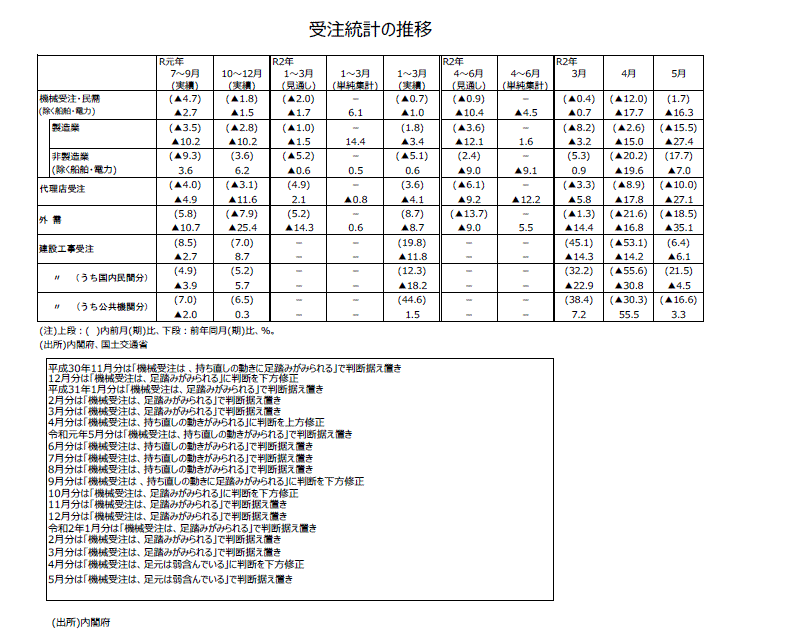 ●内閣府の基調判断の推移をみると、19年9月分では「機械受注は、持ち直しの動きに足踏みがみられる」という判断に下方修正された。その後10月分ではさらに下方修正され、18年12月分~19年3月分以来の「機械受注は、足踏みがみられる」という判断になった。11月分・12月分・20年1月分、2月分、3月分と、「機械受注は、足踏みがみられる」という判断であったが、新型コロナウイルス感染拡大の影響が大きく出た4月分では「機械受注は、足元は弱含んでいる」という判断に下方修正され、5月分では判断据え置きになった。