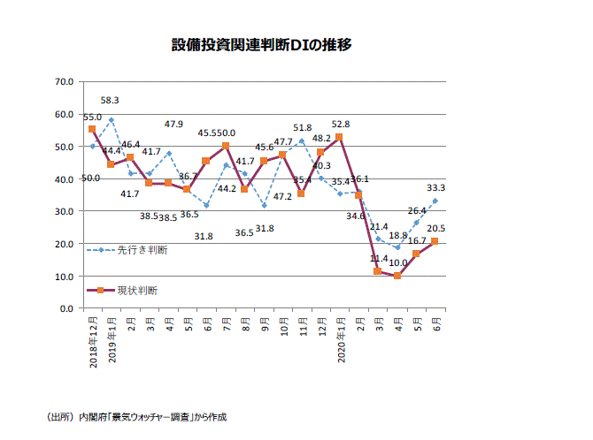 ●景気ウォッチャー調査の設備投資関連・DIの最近の動きをみよう。20年1月の現状判断DIが52.8(同9人)と18年12月分の55.0以来の50超となった。グラフからは設備投資関連・現状判断DIの底堅さが感じ取れるようになってきていた。しかし、新型コロナウイルスの影響で現状判断DIは2月34.6(同13人)、3月11.4(同11人)、4月10.0(同5人)へと急落した。その後、緊急事態宣言解除もあり、5月は16.7(同9人)、6月は20.5(同11人)と底打ちした。但し、6月のコメントは概ね「新型コロナウイルス対策による客先業界の休業は明けてきたが、設備投資をするほどのホールがなく、なかなか売上につながらないのが現状である。」(東海、電気機械器具製造業(経営者))のような厳しいものがほとんどだった。