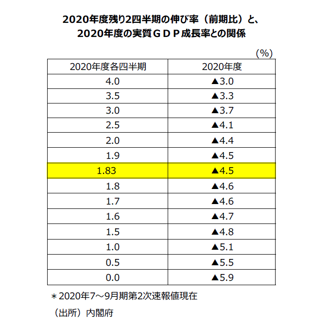 ●20年度実質GDP成長率・内閣府年央試算・前年度比▲4.5%を達成するには、20年度残り2四半期の前期比年率+7.6%(前期比+1.83%)が必要である。これからの2四半期は新型コロナウイルスの感染拡大に相当注意しながら経済活動をしていかなければならない局面であることを考えると、見通し達成は厳しい状況にあると言えよう。19年度から20年度へのゲタは▲1.3%である。20年度各四半期前期比+0.5%だと20年度実質GDP成長率・前年度比は▲5.5%のマイナス成長になる。