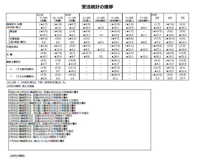 ●内閣府の基調判断の推移をみると、19年9月分では「機械受注は、持ち直しの動きに足踏みがみられる」という判断に下方修正された。その後10月分ではさらに下方修正され、18年12月分~19年3月分以来の「機械受注は、足踏みがみられる」という判断になった。11月分・12月分・20年1月分、2月分、3月分と、「機械受注は、足踏みがみられる」という判断であったが、新型コロナウイルス感染拡大の影響が大きく出た4月分では「機械受注は、足元は弱含んでいる」という判断に下方修正され、5月分では判断据え置きになった。前回6月分では「機械受注は、減少している」という判断に下方修正された。今回7月分では判断据え置きになった。機械受注(除船電民需)3カ月移動平均の前月比が▲0.1%と僅かだが、マイナスになったことなどが影響したのだろう。