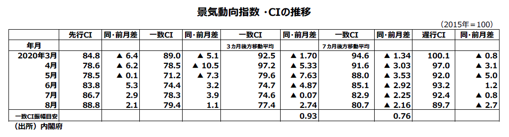 ●最近の、一致CIを使った景気の基調判断をみると、19年8月分~20年7月分は「悪化」の判断だったが、20年8月分で一致CIの前月差がプラス、かつ一致CIの3カ月後方移動平均が単月で振幅目安の0.93を上回ったので、19年5月分~7月分以来13カ月ぶりの「下げ止まり」に上方修正された。