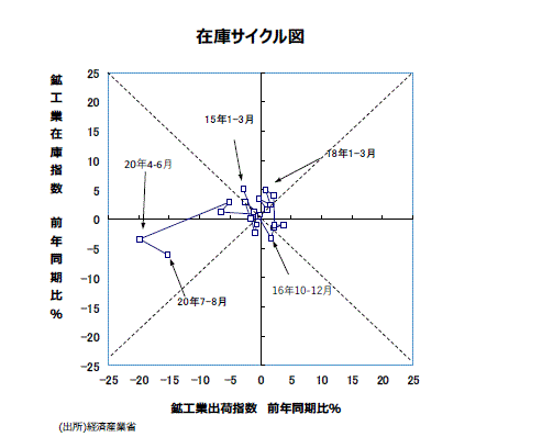 ●大きな動きをチェックするために、鉱工業全体で縦軸に在庫の前年比を、横軸に出荷の前年比をとった在庫サイクル図をつくると、17年10~12月期以降、45度線を上回って推移し、概ね「在庫積み上がり局面」が続いていた。19年10~12月期、出荷の前年同期比が▲6.5%、在庫が同+1.2%、20年1~3月期、出荷の前年同期比が▲5.2%、在庫が同+2.9%と、どちらも「在庫調整局面」であった。20年4~6月期は、出荷の前年同月比が▲19.9%、在庫が同▲3.4%と、出荷は大幅に減少したものの在庫調整がさらに進んだ。20年7~8月は、出荷の前年同月比が▲15.3%、在庫が同▲6.0%と、引き続き「在庫調整局面」の状態にある。