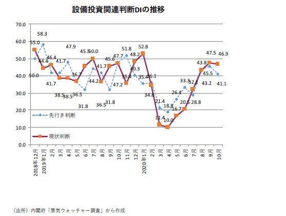 ●景気ウォッチャー調査の設備投資関連・DIの今年の動きをみよう。20年1月の現状判断DIが52.8(同9人)と18年12月分の55.0以来の50超となった。当時の設備投資関連・現状判断DIからは底堅さが感じ取れるようになってきていた。しかし、新型コロナウイルスの影響で現状判断DIは4月10.0(同5人)へと急落した。4月を底にその後、緊急事態宣言解除もあり、9月は47.5(同10人)と持ち直してきていたが、10月は46.8(同8人)に低下した。10月のコメントには「新型コロナウイルスの影響により客先業界での設備投資がほとんどなく、売上がほぼない状態で非常に悪い状況である。」(東海、電気機械器具製造業(経営者))といった厳しいものがあった。