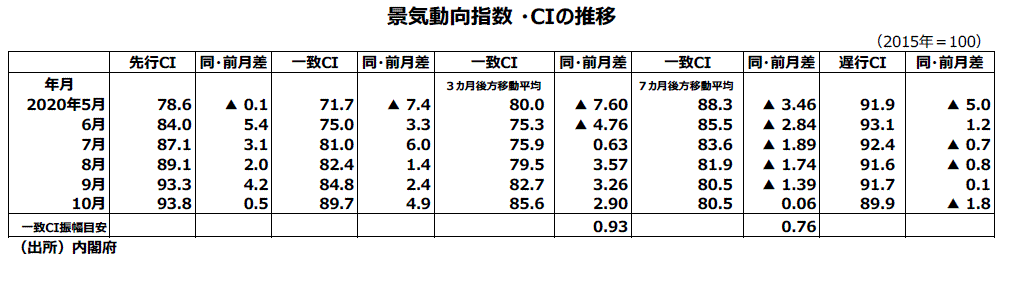 2020年10月分景気動向指数(速報値)