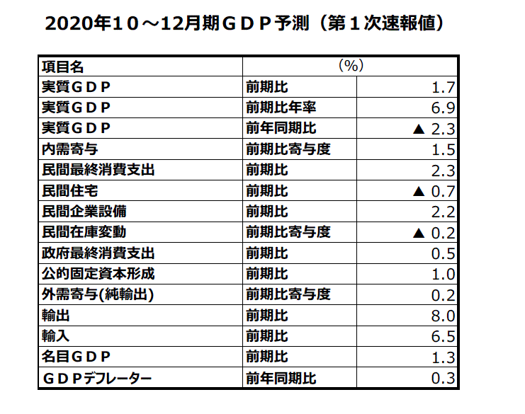 2020年10~12月期実質GDP(第1次速報値)予測