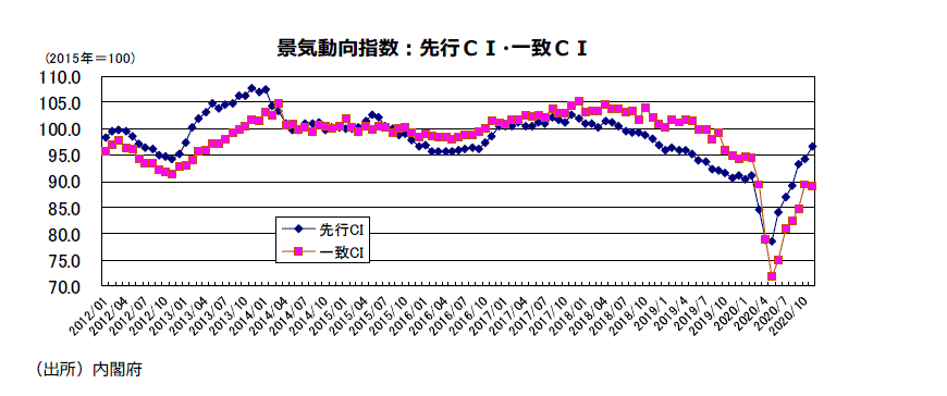 -先行CI前月差+2.3で6カ月連続上昇、一致CIは▲0.3と6カ月ぶり下降-