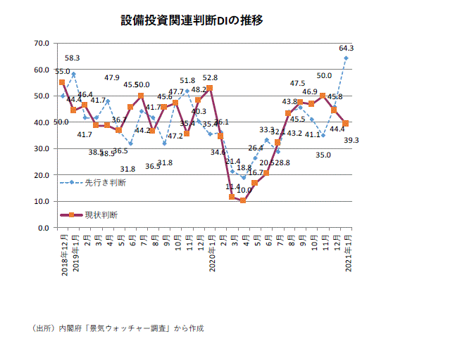 ●景気ウォッチャー調査の設備投資関連・DIの20~21年の動きをみよう。20年1月の現状判断DIが52.8(同9人)と18年12月分の55.0以来の50超となった。当時の設備投資関連・現状判断DIからは底堅さが感じ取れるようになってきていた。しかし、新型コロナウイルスの影響で現状判断DIは4月10.0(同5人)へと急落した。4月を底にその後、緊急事態宣言解除もあり、多少の上下はあったものの11月は50.0(同13人)まで持ち直した。その後新型コロナウイルス感染再拡大の中、12月は44.4(同9人)、1月は39.3(同7人)と低下している。1月のコメントには「新型コロナウイルスの第3波のため、客先業界全体も厳しくなってきた。取引先も設備投資をほとんどしないということになり、2月分等のキャンセルがたくさん入り、非常に難しい状況である」(東海、電気機械器具製造業(経営者))とコロナ禍で設備投資が出ていないことを指摘するものがあった。