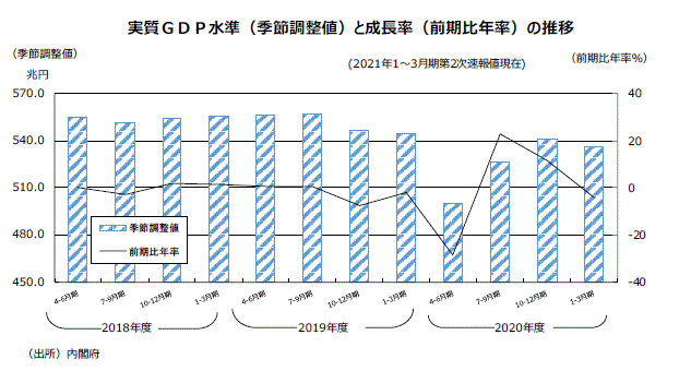 ●実質GDP季節調整値は20年4~6月期500.2兆円、7~9月期526.7兆円、10~12月期541.5兆円のあと、21年1~3月期536.1兆円となった。差額を採ると、前期差は20年4~6月期▲44.0兆円、7~9月期+26.5兆円、10~12月期+14.8兆円、21年1~3月期▲5.4兆円である。7~9月期と10~12月期を合計した戻し分は+41.3兆円で20年4~6月期の下落分の94%戻したが、そこから低下し、21年1~3月期時点では81%戻しという水準になっている。