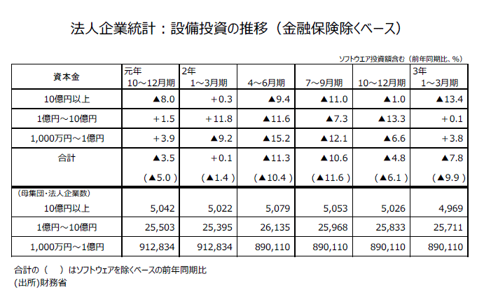 ―設備投資(除くソフトウェア)前年同期比▲9.9%、6四半期連続の減少―
