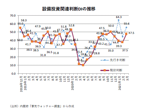 ●景気ウォッチャー調査の設備投資関連・DIの20~21年の動きをみる。20年1月の現状判断DIが52.8(同9人)と18年12月分の55.0以来の50超であった。当時の設備投資関連・現状判断DIからは底堅さが感じ取れるようになってきていた。しかし、新型コロナウイルスの影響で現状判断DIは4月10.0(同5人)へと急落した。4月を底にその後、緊急事態宣言解除もあり、多少の上下はあったものの11月は50.0(同13人)まで持ち直した。しかし、その後は新型コロナウイルス感染再拡大の中、12月は44.4(同9人)、21年1月は39.3(同7人)、2月は37.5(同14人)と低下したあと、3月は47.5(同10人)に戻っている。3月のコメントには「客への訪問がまだできないため、設備投資計画についても最終的な詰めを行うことができず、内示情報などの取得ができない。(東海・一般機械器具製造業(営業担当))」とコロナ禍で設備投資計画決定のもたつきを指摘するものがあった。