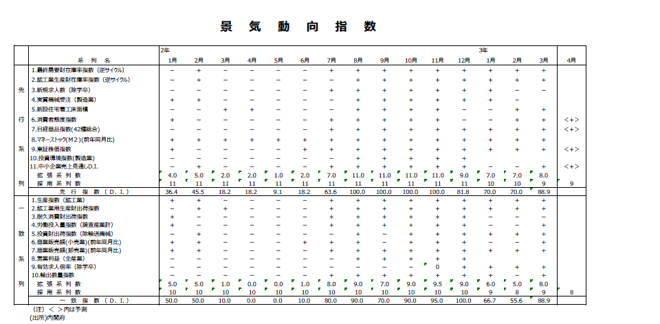 ●3月分の先行DIは88.9%と景気判断の分岐点の50%を9カ月連続で上回った。速報値からデータが利用可能な9系列中、最終需要財在庫率指数(逆サイクル)、鉱工業生産財在庫率指数(逆サイクル) 、新設住宅着工床面積、消費者態度指数、日経商品指数、マネーストック、東証株価指数、中小企業売上げ見通しDIの8系列がプラス符号に、新規求人数1系列がマイナス符号になった。