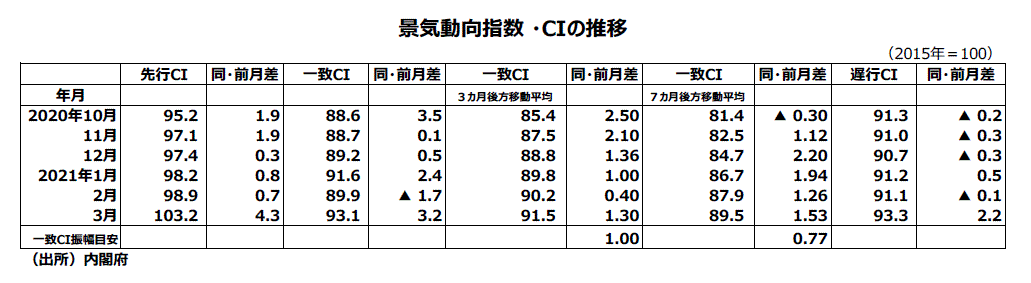 ●3月分で一致CIを使った景気の基調判断が景気拡張の可能性が高いことを示す「改善」に、「上方への局面変化」から上方修正された。3月分の一致CIの3カ月後方移動平均は9カ月連続上昇、かつ前月差が上昇なので、条件である「原則として3カ月以上連続して3カ月後方移動平均が上昇 かつ 当月の前月差の符号がプラス」を満たした。コロナ禍でも、輸出、生産の好調、雇用の底堅さなどから景気の基調はしっかりしていることを示唆するものと言えよう。