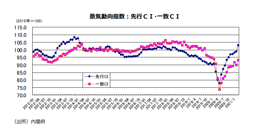 -先行CI前月差+4.3で10カ月連続の上昇、一致CI+3.2で2カ月ぶりの上昇-