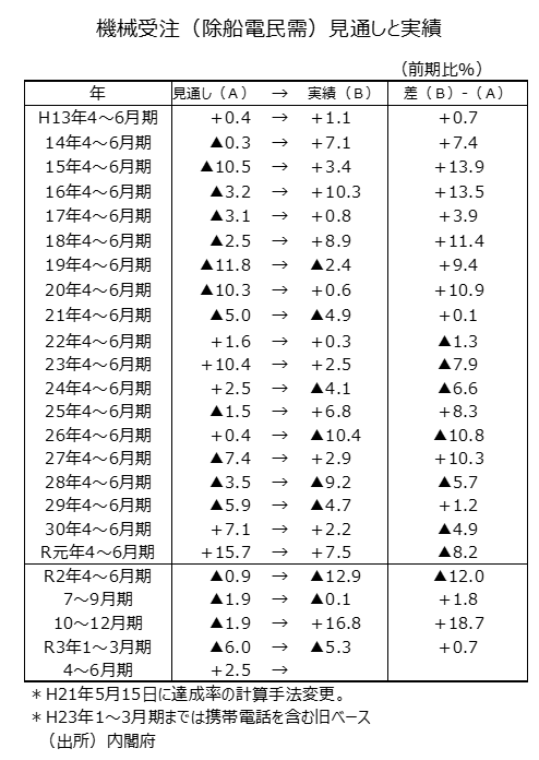 ●機械受注(除船電民需)1~3月期の前期比見通し前期比▲6.0%だったが、実績は▲5.3%になった。若干上振れしやすい傾向通りになった。4~6月期の見通しは前期比+2.5%である。新型コロナウイルス感染拡大の状況下、不透明さが大きい環境だ。4~6月期の前期比実績は09年(平成21年)から昨年までの12年間でみると、上振れ4回、下振れ8回であり、下振れしやすい傾向がある四半期である。今回発表された4~6月期の見通しは単純集計値に過去3四半期平均の達成率96.7%をかけたものである。4~6月期の前期比見通しの+2.5%を達成するためには、各月の前月比+1.6%が必要である。また各月の前月比が0.0%なら4~6月期の前期比は▲0.6%になる。
