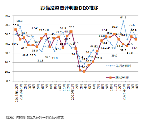 ●景気ウォッチャー調査の設備投資関連・DIの20~21年の動きをみる。20年1月の現状判断DIが52.8(回答数9人)と18年12月分の55.0以来の50超であった。当時の設備投資関連・現状判断DIからは底堅さが感じ取れるようになっていた。しかし、新型コロナウイルスの影響で現状判断DIは4月10.0(同5人)へと急落した。4月を底にその後、緊急事態宣言解除もあり、多少の上下はあったものの11月は50.0(同13人)まで持ち直した。しかし、その後は新型コロナウイルス感染再拡大の中、12月は44.4(同9人)、21年1月は39.3(同7人)、2月は37.5(同14人)と低下したあと、3月は47.5(同10人)に戻り、4月は44.4(同9人)になっている。4月のコメントには「客の設備投資意欲が増しており、案件の引き合い数は確実に増加傾向にある。(九州・金属製品製造業(事業統括))」というコメントがあった。