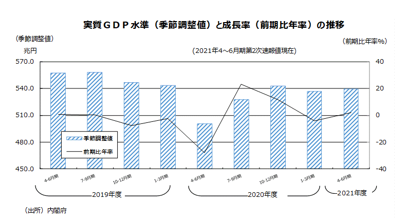 ●実質GDP季節調整値はコロナ禍前の19年7~9月期の557.8兆円をピークに下落し、20年4~6月期に500.7兆円まで低下した。20年10~12月期542.5兆円まで一旦戻した後、21年1~3月期536.8兆円、4~6月期539.3兆円となった。21年4~6月期時点は20年4~6月期から+38.6兆円高い水準で、19年7~9月期から20年4~6月期への下落分▲57.1兆円の68%を戻した水準になっている。