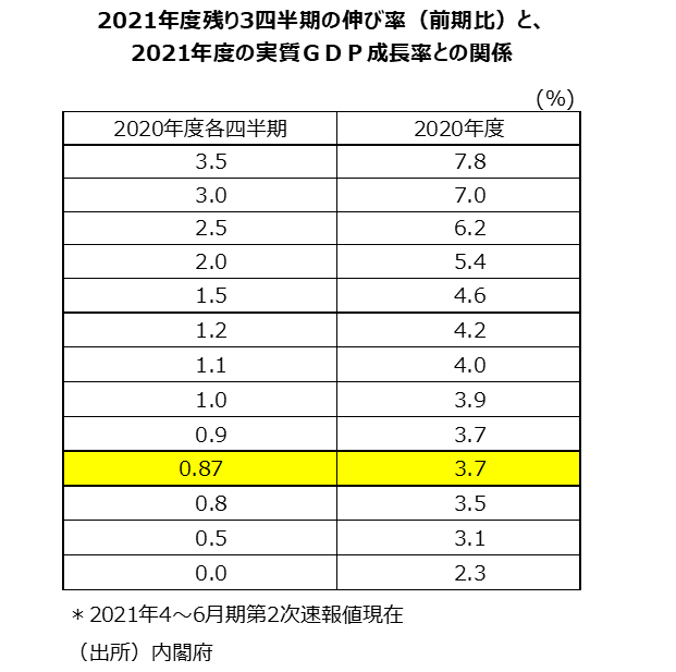 ●「令和3年度内閣府年央試算」の21年度実質GDP成長率見通し・前年度比+3.7%を達成するには、21年度残り3四半期で各々前期比年率+3.6%(前期比+0.87%)が必要である。20年度から21年度へのゲタは+1.8%である。なお、21年度残り3四半期が前期比+0.5%だと21年度実質GDP成長率・前年度比は+3.1%になる。21年度各四半期が前期比+1.0%だと21年度実質GDP成長率・前年度比は+3.9%になる。