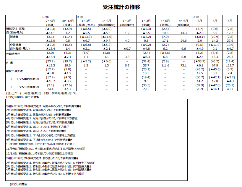 ●21年1月分では「持ち直している」で内閣府の基調判断は据え置きであった。2月分では「持ち直しの動きに足踏みがみられる」に判断が下方修正され、3月分・4月分でも同じ判断だった。今回5月分で「持ち直しの動きがみられる」に上方修正された。機械受注(除船電民需)の3カ月移動平均が4カ月ぶりに増加に転じたことなどを反映しているようだ。