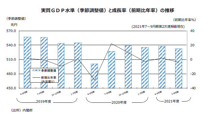 ●実質GDP季節調整値は景気の谷の20年4~6月期501.1兆円を底に、振れを伴いつつ持ち直し傾向で21年4~6月期に537.6兆円になったあと、7~9月期532.8兆円となった。差額を採ると、20年4~6月期から21年7~9月期まで戻した額は31.7兆円である。コロナ禍前のピークはこれまでの19年7~9月期から19年4~6月期に変わったが、19年4~6月期557.3兆円から谷までの下落分56.1兆円を、21年7~9月期時点で56.5%戻した格好になっている。