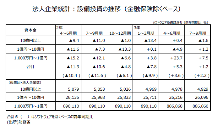 ―設備投資(除くソフトウェア)前年同期比+2.2%、1.4㌽増加率鈍化―