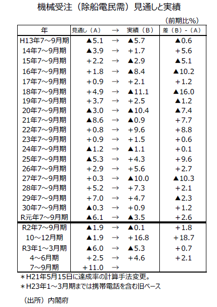 ●21年1月分では「持ち直している」で内閣府の基調判断は据え置きであった。2月分では「持ち直しの動きに足踏みがみられる」に判断が下方修正され、3月分・4月分でも同じ判断だった。5月分で「持ち直しの動きがみられる」に上方修正され、前回6月分に続き今回7月分でも据え置きとなった。機械受注(除船電民需)の前月比が+0.9%の増加、そして3カ月移動平均が3カ月連続増加しているが、一方で非製造業が前月比マイナスに転じたことなど、総合的に判断しているようだ。