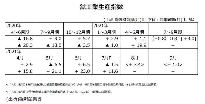●7月分鉱工業生産指数では、全体15業種のうち、半導体製造装置などの生産用機械工業など9業種が前月比上昇したものの、自動車工業や電気・情報通信機械工業等の6業種が前月比低下し、全体として低下となった。自動車工業等では、半導体不足が長引いているところに、新型コロナウイルスの感染拡大のためアジア各国で経済活動が制限されたことによる部材調達不足の影響が出たようだ。