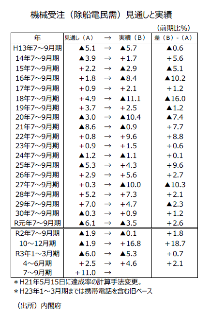 ●機械受注(除船電民需)の7~9月期・前期比実績は09年(平成21年)から昨年までの12年間でみると、上振れ10回、下振れ2回であり、上振れしやすい傾向がある四半期であるが、今年は下振れる可能性が大きそうだ。但し、9月の前月比が0.0%でも7~9月期の前期比は+0.7%と2四半期連続の増加になる。今月の製造業の前月比大幅減少に、半導体不足の影響があるかどうかは機械受注統計ではわからないようだ。足踏みの判断になったものの、設備投資の基調には底堅さが感じられる状況ではあるだろう。