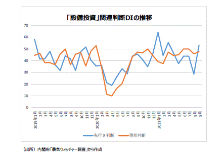 ●景気ウォッチャー調査の設備投資関連・DIは、20年1月の現状判断DIが52.8(回答数9人)と景気判断の分岐点50を上回り底堅さが感じ取れる感じだったが、20年4月に新型コロナウイルスの影響で現状判断DIが10.0(同5人)へと急落した。4月を底に多少の上下はあったものの11月は50.0(同13人)まで持ち直した。しかし、その後は新型コロナウイルス感染状況に翻弄されるように、21年2月に37.5(同14人)と低下した。その後、21年3月47.5(同10人)、4月44.4(同9人)、5月45.0(同5人)、6月50.0(同7人)、7月50.0(同7人)、8月45.8(同6人)、9月47.7(同11人)と推移している。9月では「製造業では設備投資に対して積極的になっている。」、というコメントをする景気ウォッチャー(北陸・一般機械器具製造業(総務担当))がいた。
