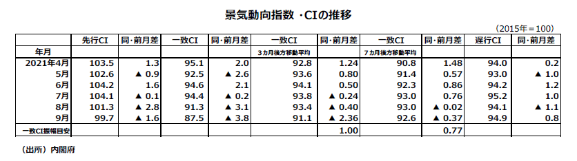 ●最近の、一致CIを使った景気の基調判断をみると、20年8月分で「悪化」から「下げ止まり」へと13カ月ぶりに上方修正された。その後、20年9月分から12月分まで「下げ止まり」で同じ判断が継続した。21年1月分で「上方への局面変化」に上方修正され、2月分では判断が据え置かれた。3月分で景気拡張の可能性が高いことを示す「改善」に上方修正され、4月分~8月分と「改善」の判断は据え置きになっていた。