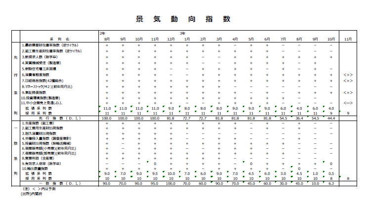 ●また、11月分の先行DIでは、数値が判明している消費者態度指数、日経商品指数、東証株価指数、中小企業売上げ見通しDIの4系列では、消費者態度指数、日経商品指数、東証株価指数の3系列がプラス符号に、中小企業売上げ見通しDIの1系列がマイナス符号になることが判明している。11月分速報値段階の先行DIは33.3%以上88.9%以下になることが確定している。
