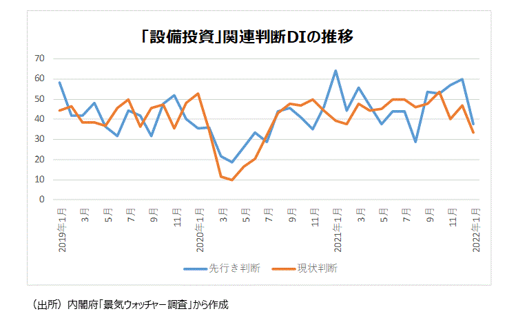 ●一方、設備投資関連・先行き判断DIは21年5月37.5(回答した景気ウォッチャー・6人)、6月43.8(同4人)、7月43.8(同8人)と推移し、8月28.7(同7人)に落ち込んだ後、戻して、9月53.6(同7人)、10月52.8(同9人)、11月57.1(同7人)、12月60.0(同5人)と4カ月連続の50超になった後、22年1月37.5(同8人)まで低下した。1月では「食品の原料価格の高騰に加えて、設備投資に必要となる電子機器などの不足で、様々な厳しい状況が慢性化している。(近畿・化学工業(企画担当))」というコメントがあった。