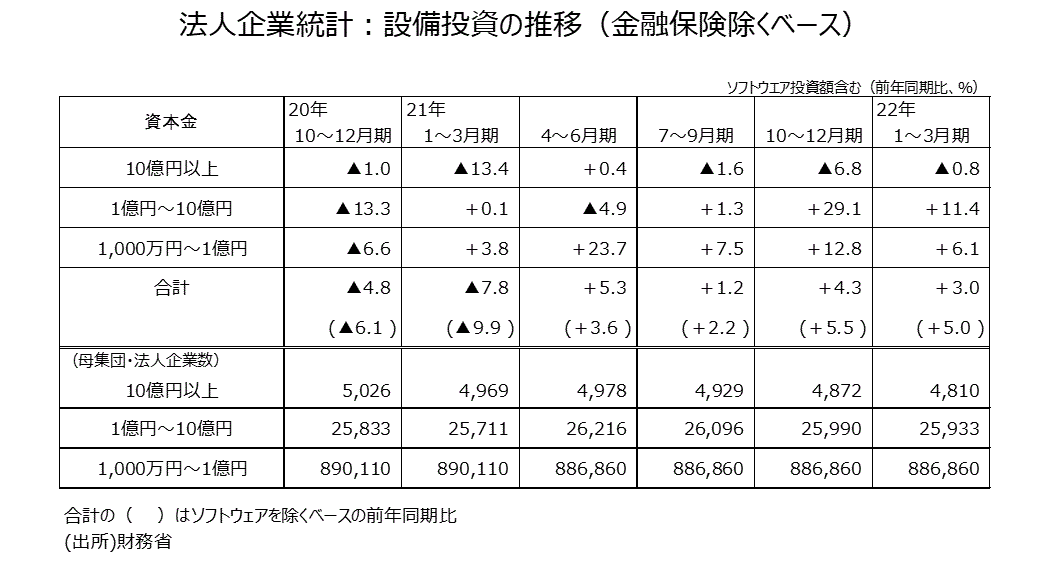 22年1~3月期の法人企業統計調査の全産業(金融業・保険業を除くベース)の設備投資(ソフトウェア投資額を除くベース)の前年同期比は+5.0%と、10~12月期の前年同期比+5.5%から0.5ポイント伸び率が鈍化したものの、4四半期連続の増加になった。10~12月期で前年同期比+7.5%の増加だった製造業は、1~3月期では同+5.9%の増加へと1.6ポイント鈍化した。非製造業は10~12月期で前年同期比+4.4%の増加だったが、1~3月期で同+4.6%の増加と0.2ポイント伸び率が改善した。