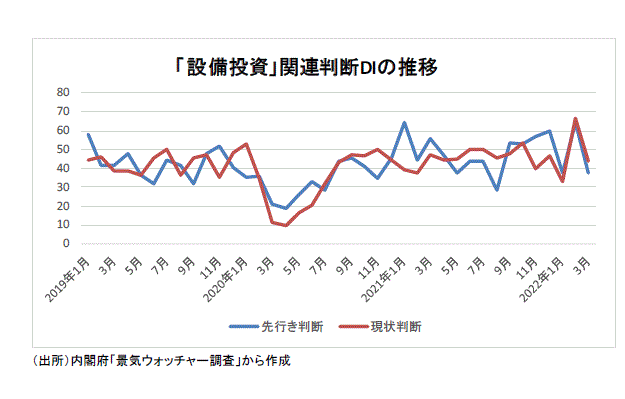 ●一方、設備投資関連・先行き判断DIは21年5月37.5(回答した景気ウォッチャー・6人)、6月43.8(同4人)、7月43.8(同8人)と推移し、8月28.7(同7人)に落ち込んだ後、戻して、9月53.6(同7人)、10月52.8(同9人)、11月57.1(同7人)、12月60.0(同5人)と4カ月連続の50超になった。その後、22年1月37.5(同8人)、2月は66.7(同3人)、3月は37.5(同6人)と推移している。3月では「3か月先もまだ新型コロナウイルスの影響が続いていると思う。客先業界の設備投資への意欲が復活するのは大分先なので、余り変わらない。(東海・電気機械器具製造業(経営者))」というコメントがあった。