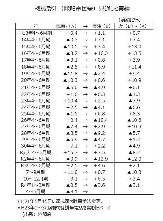 ●機械受注(除船電民需)4~6月期の前期比見通しは▲8.1%になった。ウクライナ情勢、それに影響を受けた原材料高に加え、新型コロナウイルスの感染拡大を受けた上海のロックダウンなどから、企業が設備投資に慎重になったとみられた。4~6月期の前期比実績は09年(平成21年)から21年までの13年間でみると、上振れ5回、下振れ8回であり、若干下振れしやすい傾向がある四半期である。22年(令和4年)の見通しは単純集計値に過去3四半期平均の達成率87.4%をかけたものである。見通しの算出に使った達成率がかなり低いこともあり、今年は実績が上振れる可能性の方が大きそうに思われる。