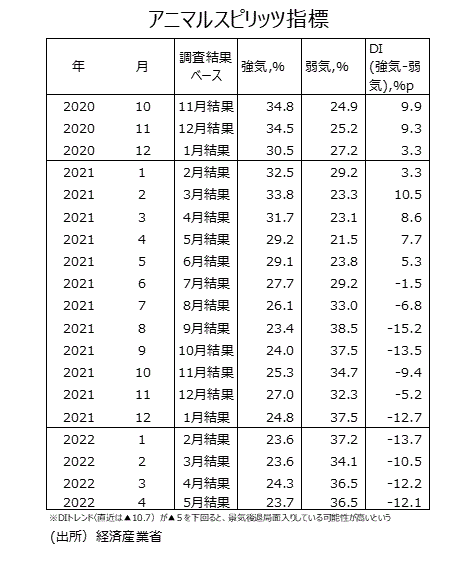 ●経済産業省は製造工業生産予測指数からアニマルスピリッツ指標を作成している。21年6月調査結果で、アニマルスピリッツ指標(生産活動マインド指標:DI)は10カ月連続のプラスの数値となり、企業の生産マインドは強気超の状況が続いていたが、21年7月~22年5月調査結果ではDIはマイナスになっている。22年5月調査結果のDIは▲12.1である。22年4月調査結果のDI▲12.2から僅かにマイナス幅が縮小した。