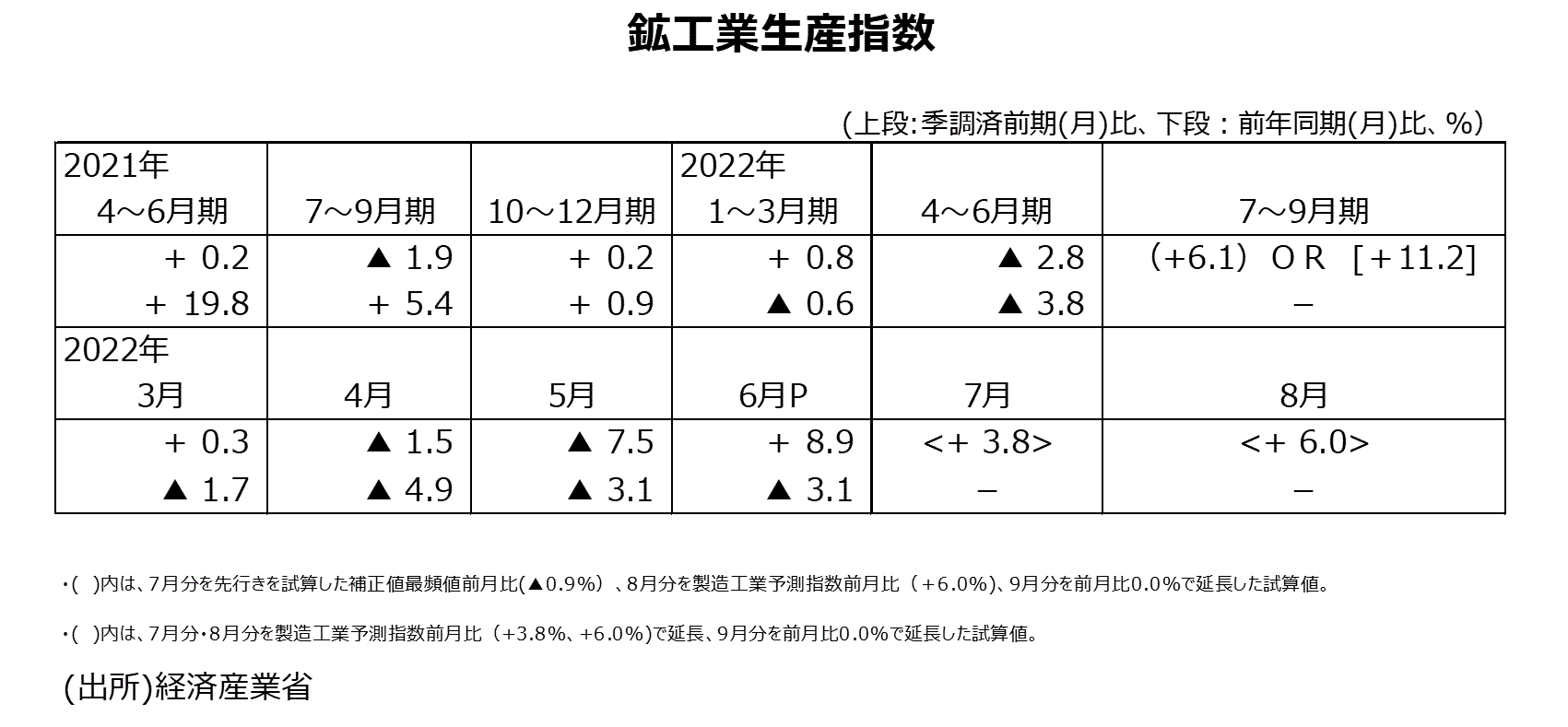 ●6月分鉱工業生産指数では、全体15業種のうち、中国でのロックダウン解除等を受けて、自動車工業や電気・情報通信機械工業、電子部品・デバイス工業など11業種が前月比上昇、鉄鋼・非鉄金属工業など4業種が前月比低下した。