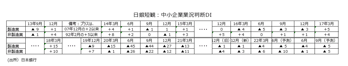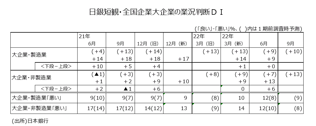 ―大企業・製造業・業況判断DI+9と5㌽悪化、非製造業は+13で4㌽改善―