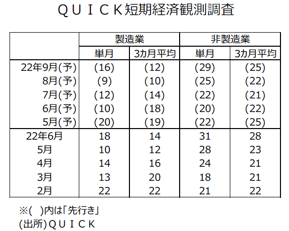 ●日銀短観の大企業・業況判断DIの9月までの「先行き見通し」は、QUICK短観やロイター短観などを参考にして、製造業は6月実績比1ポイントの改善の+15程度、非製造業は6月実績比変わらずの+19程度と予測した。足元の物価高騰が秋にかけて続きそうなことなど、先行きの不透明さが景況感の改善の足踏み材料になりそうだ。