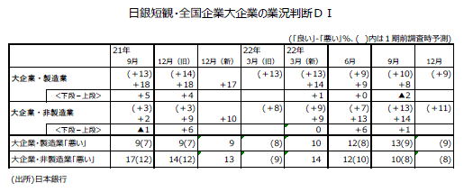 ●一方、大企業・非製造業・業況判断DIでは、前回6月調査で+13のプラスだったが、今回9月調査では1ポイント改善し+14になった。1ポイントずつでほぼ横ばい圏ではあるものの、製造業が悪化、非製造業が改善と対照的な動きになった。非製造業は前回6月調査の「先行き」見通し+13を1ポイント上回り、事前の予想を僅かに上回って、足元の景況感が改善し底堅さが感じられる数字となった。新型コロナウイルス感染第7波があっても、経済活動自粛要請がなかったことなどがプラスに働いたとみられる。