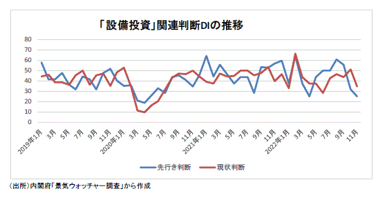 ●景気ウォッチャー調査の設備投資関連・現状判断DIは、22年3月43.8(同8人)、4月37.5(同4人)、5月37.5(同6人)、6月28.6(同7人)、7月42.9(同7人)、8月46.9(同8人)、9月43.8(同4人)、10月51.1(同7人)、11月35.0(同5人)と推移している。11月では「一時の急激な円安は落ち着き、輸入原材料の価格高騰への不安感が少し収まりつつある。ただし、通信系の輸入機器は依然納期が遅れており、システム構築全体にも影響するケースがみられる。ネット放送の定着により高速通信の要望は継続しており、対応するための設備投資意欲は変わっていない。(東海:電気機械器具製造業(総務担当))」というコメントがあった。