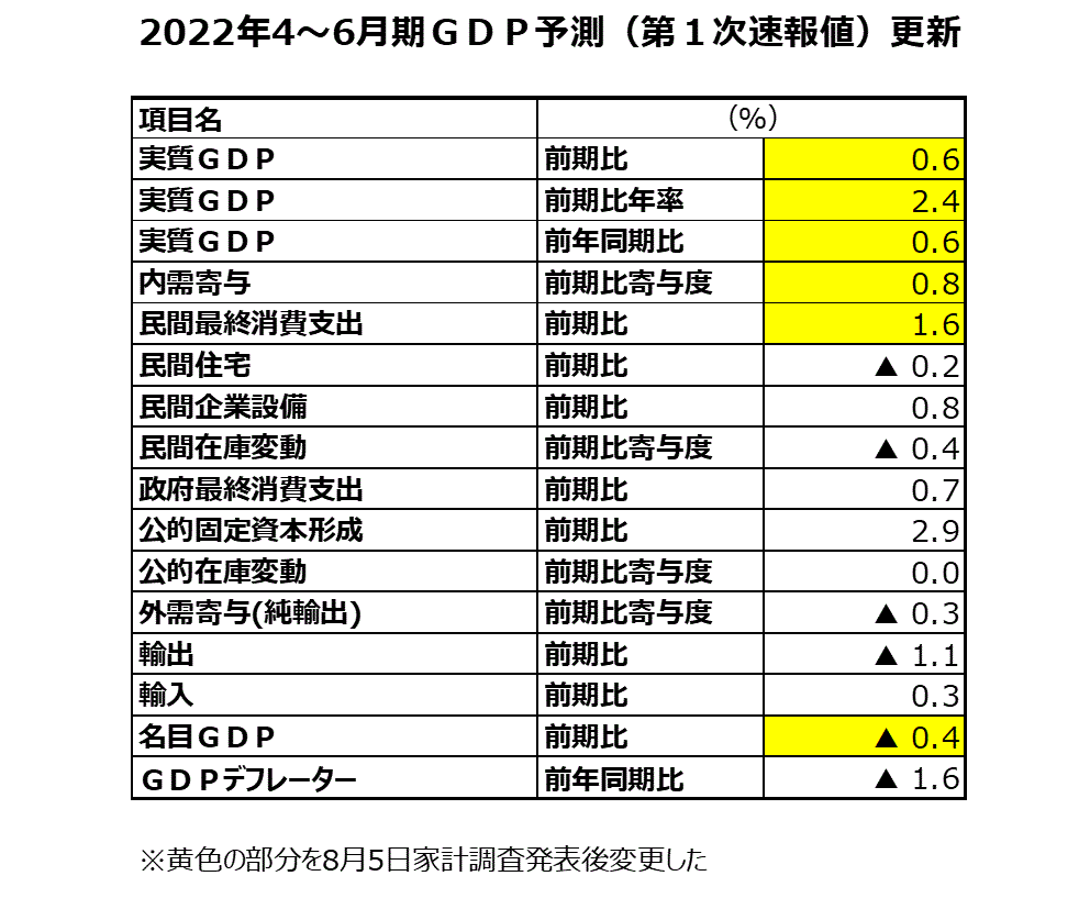 2022年4~6月期実質GDP(第1次速報値)予測・個人消費更新