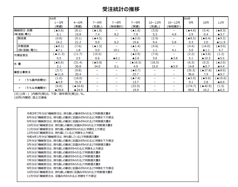 ●内閣府の基調判断の推移をみると、22年4月分では、「持ち直しの動きに足踏みがみられる」から「持ち直しの動きがみられる」へと4カ月ぶりに上方修正された。5月分・6月分・7月分・8月分と、「持ち直しの動きがみられる」の判断が継続したが、9月分では「持ち直しの動きに足踏みがみられる」に判断が下方修正された。前回10月分では前月比は増加に転じたものの、3カ月移動平均の前月比が引き続き減少したことなどから、判断据え置きになったようだ。今回11月分では、持ち直しの動きが外れ、「足踏みがみられる」に判断がさらに下方修正された。11月は製造業・非製造業とも前月比減少となったこと、3カ月移動平均の前月比が3カ月連続減少したことなどが要因だ。