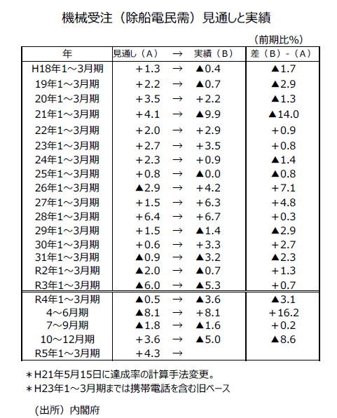 ●機械受注(除船電民需)の10~12月期は前期比+3.6%の見通しであったが、実績は前期比▲5.0%と見通しを大きく下回った。機械受注(除船電民需)の10~12月期・前期比実績は2009年(平成21年)から21年までの13年間でみると、上振れ9回、下振れ4回と上振れしやすい傾向にあったものの、22年は下振れた。