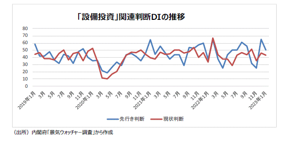 ●景気ウォッチャー調査の設備投資関連・現状判断DIは、22年3月43.8(回答したウォッチャー8人)、4月37.5(同4人)、5月37.5(同6人)、6月28.6(同7人)、7月42.9(同7人)、8月46.9(同8人)、9月43.8(同4人)、10月51.1(同7人)、11月35.0(同5人)、12月45.8(同6人)、23年1月42.9(同7人)と推移している。1月では「半導体関連の取引先からは設備投資抑制の話が聞こえている。特にメモリ関連で投資抑制の可能性があり、対中輸出規制の関係で中国市場のリスクも高まっている。半導体設備の市場はやや悪くなっている。(東北:電気機械器具製造業(企画担当))というコメントがあった。