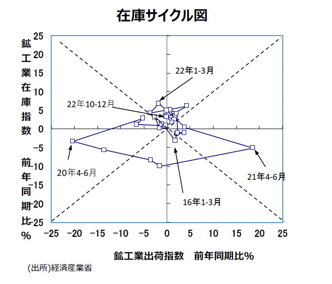 ●鉱工業全体の在庫循環の動きをチェックするために、縦軸に鉱工業在庫指数・前年比、横軸に鉱工業出荷指数・前年比をとった在庫サイクル図をつくると、20年10~12月期、21年1~3月期では「意図せざる在庫減局面」に、4~6月期、7~9月期では「在庫積み増し局面」だった。10~12月分では、「在庫積み上がり局面」となった。22年1~3月期、4~6月期、7~9月期も「在庫積み上がり局面」継続となった。10~12月分では、在庫が前年比+3.28%、出荷が前年比0.0%で、引き続き「在庫積み上がり局面」になっている。